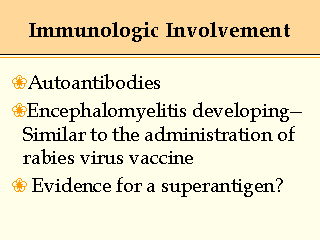 There is little question that immunologic involvement plays a role in MS. There are autoantibodies to the myelin sheath, and now some very interesting evidence for superantigen involvement. |