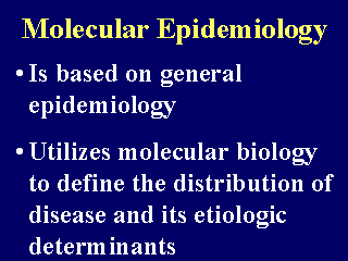 by general epidemiology. However, molecular epidemiology utilizes molecular biology to define the distribution of disease in a population (i.e., descriptive epidemiology) and identify its potential etiologic determinants (i.e., analytical epidemiology). |