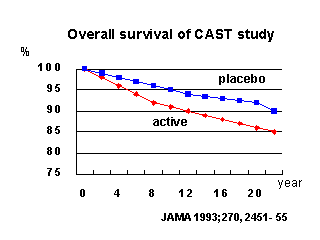 ![]() | Another example of clinical trial is CAST (cardiac arrhythmiasuppression trial). This study was designed to prove if antiarrhythmic therapy is beneficialfor patients with myocardial infarction. However, results is completely opposite. Patients with antiarrhythmictherapy If this study was not conducted, patient might be kept treated by harmfuldrug. |
