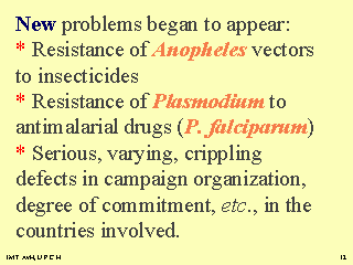 Most of these “new” problems were foreseen by the planners and advocates of the Malaria Eradication Program. In fact, the rush to get the campaign started, was because there was a need to get the upper hand on malaria before the mosquitoes became resistant to the insecticides to be used. Among the strategies in the eradication plan was the constant monitorization of insecticide resistance of the vectors in each area under attack and consolidation. |