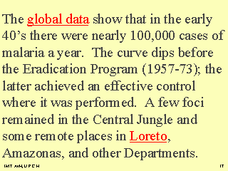 The series of maps presented, which is due to the efforts of many Peruvian malariologists, is very didactic. The RED areas are endemic for malaria, and the YELLOW areas are those where transmission was interrupted in te year shown. Please NOTE the trends and compare the initial and final maps! When was the BEST year for control? (That is, the year with the LEAST area with malaria transmission.
