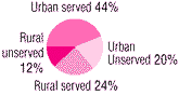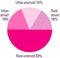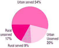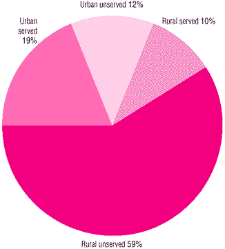 The variability in rural and urban sanitation, for instance, can be seen for four major regions. Of the unserved in developing countries (2900 million), 80% live in rural areas. |