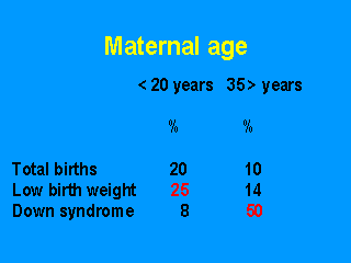 The ideal maternal age is between 20 and 34 years. Both extremes of the
