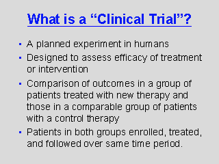 一個臨床試驗的中心觀念,在於其設計是允許依據一個已設定的計畫案,同時評估兩組或更多組的治療結果。 這個比較可能是兩種治療方式 (例如, 治療 A 和治療 B), 或是一個新的治療方法與沒有治療, 或在兩種以上治療方法間做比較 (例如, 一個新藥物之不同劑量)。