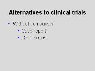 除了臨床試驗外, 其他方式的研究方法也可以被用來證明此治療方法的優點。 病例報告和一系列病例只提供薄弱的證據, 而只不過是表示一種結果的可能性。為了要宣稱一個新的治療方法是較好的, 你必須能夠回答“比什麼方法較好?”的質問。病歷報告和一系列病例對於產生假說是最有用的, 而我們可以在比較研究中測試這個假說。