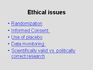給予病人隨機分配治療方法是合乎道德嗎 ? 而當一個有希望的,但其效果尚未知的新治療法可用時,不做隨機分配是合乎道德嗎?能夠獲得把真實情況告知後的同意書嗎?何時使用安慰劑是恰當的呢 ? 在試驗期間的治療效果 (利點以及/或缺點)應被監控嗎? 還有應如何來利用中間過渡期的結果呢? 在許多國家,臨床研究不被認為是合乎道德的, 除非其治療試驗已經被其他願擔負確保其符合道德標準 (這些團隊經常是指一個研究機構的評估委員會或是一個倫理評估委員會)的評估團隊所認可。 在大部分的案例中, 參與試驗的人必須先被告知此試驗的本質為何,以及參與試驗時可能發生的潛在的風險和利益, 並且要獲得明確的允諾同意參與試驗。至於何時使用安慰劑(無治療的群組)做為比較才是合乎道德一項,則目前仍有爭議。 在一些案例中,科學的利益與社會倫理的利益會有所衝突。 一個切題的例證就是美國國家衛生院(National Institutes of Health)所贊助的臨床試驗案例中要求須要有性別和種族的“代表性(representativeness)”。 這些和許多其他道德事項在臨床試驗的設計和執行上是必然的。 有關這些主題的討論可在目前許多的文獻和網際網路的網站上看到。 (王慧虹 翻譯)