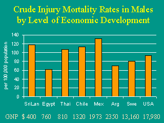 On a national basis, however, the argument is much more chaotic. The theory of declines in injury mortality with economic progress does not exist in some areas. Within both developed and developing countries, wide variations exist in injury mortality rates. For example, deaths from injuries are higher in the USA than in Sweden. What factors may account for this observation? |