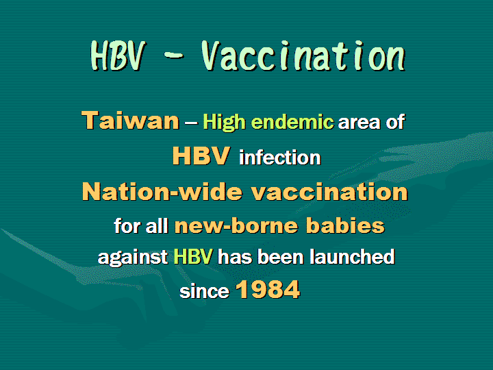 | Taiwan, with a population of 2.3 million, is a high endemic area of HBV infection with carrier rate of 15~20 % in general population. The nation-wide vaccination against HBV has been enforced on all new born babies since July 1985 (only for newborn babies born to HBsAg-positive mother in 1984). |