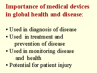 radiologic equipment. Devices used in treatment/prevention: surgical equipment, cardiovascular devices such as pacemakers, drug-delivery devices such as nebulizers. Devices used in monitoring: ultrasound. Potential for patient injury: false positives/negatives on diagnostic tests may have serious consequences. Infections can be transmitted via "dirty" devices. Biomaterials in devices (e.g. latex, silicone) can cause adverse events. Malfunctions can cause patient injury. |