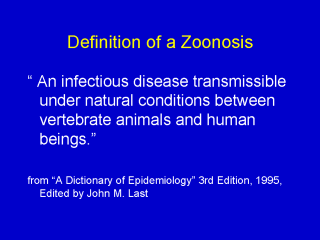 More than 150 infections are recognized as zoonotic. The transmission of infectious agents from animals to humans results in significant mortality and morbidity. National and international surveillance systems have been established to monitor zoonotic diseases and to characterize their pattern by person, place, and time. Early recognition of epidemics of a zoonotic disease is important for its control.
