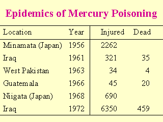The first recorded case of poisoning was of a mercury miner in the 15th century. Widespread incidents have been reported only during the last two decades. The most disastrous epidemic of mercury poisoning known, is also the most recent; it took place in Iraq, 1972. These incidents resulted from the eating of mercury-contaminated of seed grain treated with alkylmercury compounds. The significant incidents from the pollution caused health damage have been those in Japan at Minamata and at Niigata.