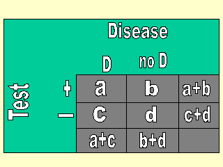 檢驗結果在兩群組中都可以是陽性或陰性反應。也許你希望看到檢測結果在有病的人是陽性,而沒病的人則是陰性;但事實上,並不一定老是這樣。在表中 b 表示偽陽性結果;而 c 則表示偽陰性結果。
