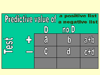 同樣地陰性預測值是指檢驗結果為陰性的案例中真正沒有病的人佔多少 (d/c + d)。