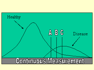 左圖表示為什麼敏感度和特異度不會一致的理由。當你連續測定如血壓或血糖以區別病人和健康的人時你是如何設定界定值 (cut off)呢?是在 A 或 B 或 C 點? 在 A 點時你實際上會得到所有的病人(高敏感度但是也包括不少健康的人在陽性反應中),在 C 點時,你可以避免包括健康的人但卻會遺漏病人的一半。 |