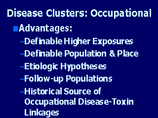 Workplaces tend to have higher more definable exposures than communities. For example, the majority of allowable workplace chemical concentrations in the US are in the parts per million (ppm) while those for community exposure are in the parts per billion (ppb). The populations are often more uniform (i.e. healthy workers) and easily identifiable (such as personnel records). The geographic boundaries of a particular workplace are definable as opposed to those of a community and the risk of the Texas Sharpshooter bias. Etiologic hypotheses are easier to develop and substantiate due to existing exposure data (such as job titles or known job exposures). Appropriate follow up worker populations often exist worldwide due to the internationalization of industry. It should be noted that many of the disease-toxin linkages which are now an accepted part of the occupational and environmental literature were first discovered as occupational disease clusters. These range from male reproductive toxicity and the pesticide dibromochloropropane (DBCP) to angiosarcoma of the liver and vinyl chloride monomer exposure. |
