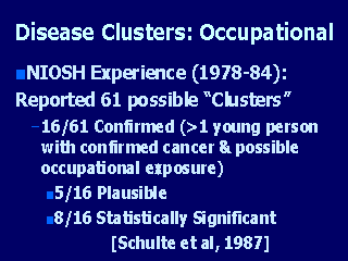 Furthermore, a publication by the US National Institute of Occupational Safety and Health (NIOSH) also provides a warning. In their experience of occupational disease cluster investigations from 1978-84, of a 61 reported clusters, only 16 were confirmed (based on a definition of at least 1 young person with confirmed cancer and possible occupational exposure). Of these 16 confirmed clusters, only 5 had a plausible etiologic relationship while 8 were statistically significant. |