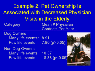 From: Stressful Life Events and Use of Physician Services Among the Elderly: The Moderating Role of Pet Ownership. Siegel JM. 1990. J of Personality & Social Psychology, 58(6):1081-1086. The physician utilization of 938 Medicare enrollees in a health maintenance organization was prospectively followed for 1 year. When demographic characteristics and health status at baseline were controlled for, pet owners reported fewer doctor contacts over the 1-year period than non-pet owners. Furthermore, pets seemed to especially help their owners in times of stress. The accumulation of prebaseline stressful life events was associated with increased doctor contacts during the study year for respondents without pets, but not for for pet owners. *Stressful life events included: separation or divorce, death of close family member, major illness of spouse, job retirement, death of close friend, move, being victim of crime, and money problems. |