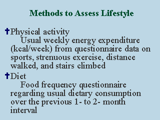 We can use these methods to assess lifestyle. Due to differences in physical activities and food items in different populations, the specific physical activities and food items in the study population should be evaluated and included in the study questionnaires. |