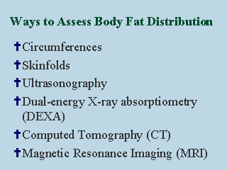 Body fat distribution affects risk for type 2 diabetes. To examine this, various techniques can be used, including the following: circumferences, skinfolds, ultrasonography, dual-energy X-ray absorptiometry, computed tomography and magnetic resonance imaging. |