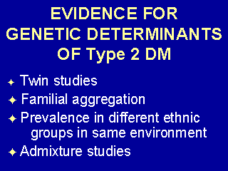 There are a number of lines of evidence that indicate the importance of genetic factors in the development of Type 2 diabetes. They include data from the twin studies, family studies, studies among different ethnic groups living in the same environment and admixture studies. |
