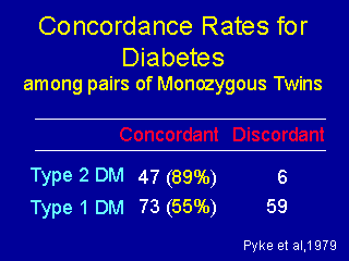 A stong argument for the importance of genetic factors in the development of diabetes comes from concordance studies in identical twins. The concordance rate for Type 2 diabetes in older twins reaches 90% while that for Type 1 diabetes is about 50%. In both Type 2 and Type 1 diabetes, these rates are much higher than the concordance rates seen in non-identical (dizygous) twins or among siblings.