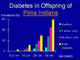 Type 2 Diabetes shows familial aggregation in all populations including the Pima Indians. The prevalence of diabetes is higher among offspring when either or both of their parents have diabetes. This has also been demonstrated in many other studies. The risk of developing Type 2 diabetes among the offspring is greater when the mother is affected than when the father is affected. |