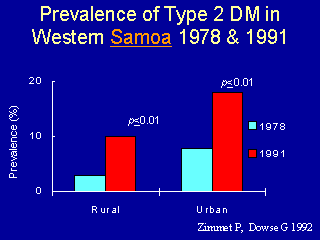 These are prevalence data from the Pacific island country of Western Samoa at two different times, in 1978 and 1991. The prevalence of diabetes increased markedly over a 13-year period. This is true in both the rural and urban populations. The prevalence rate is lower among the rural inhabitants than the urban ones, a finding reported in many other populations. The results demonstrate: 1)A rapid change in diabetes prevalence that can only be attributed to a changing environment, and 2) Differences in the prevalence in the same ethnic group (Polynesians) living in a different environment i.e. rural vs. urban.