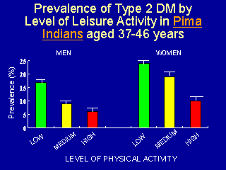 Physical activity is another important factor in the development of Type 2 diabetes. Subjects who are in the least active third of the population have a three times greater prevalence of Type 2 diabetes as compared with the third who are most active. This is true both for men and women.