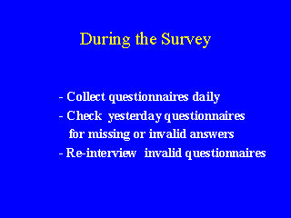 在調查研究中,訪查員必須儘可能在每天訪問完後回到辦公室。隔天必須把問卷資料鍵入電腦中,以確定實際調查的有效性。如果發現有錯誤時,訪問員仍然可以憑藉記憶提供正確的答案,或是可以回來重新做適當的尋問,這只不過是兩天後的事情而已。 如果想在調查結束後再修正錯誤,通常是不可能的。 |