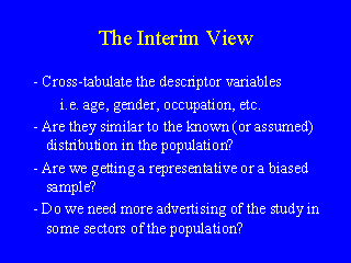 要注意,我是說中間觀察,不是中間分析。在調查研究進行中的幾個點,必須將已經鍵入過和查證過的問卷的描述樣本的變數和分層或分組的變數,跟檢查所獲得的回答數目一起交互列表下來。我們是否獲得了我們所要的均衡的樣本?每一分層的數目是否與我們所預期的一樣?