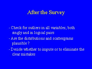 所有的資料都好了。我們在鍵入資料時核查了是否有錯誤,但依然會有些錯誤。現在我們必須交互核查所有的變數;極端的數值是否為真實的,或是錯誤所造成的?重要變數間的相關性看來是否合理的,或是其中的一個問題很明顯地被解釋錯誤?如果發現有錯誤,則我們必須做以下的決定: