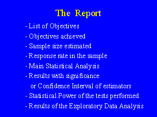 最後是研究的最重要的部分,就是調查結果的報告。這份報告必須要表列有目標,討論到哪些項目已完成,而哪些是未完成的,並說明理由。報告可預期的錯誤,將會幫助正計劃從事相同調查研究工作的人避免相同的錯誤。報告研究對象的目標數目和獲得回答數的百分比。並報告,和計劃書中所預期的效力相比,這個結果會如何影響所執行的檢定的統計效力。最後是主要的分析,要以估計者的信賴範圍 (confidence interval) 和統計檢定的效力來做。