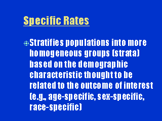 In contrast to crude rates, specific rates are based on strata of a population that reflect more homogeneous groups (i.e., by age, gender, sex, race). These variables may influence the outcome of interest. Therefore, examination of specific rates gives a more complete description of the mortality experience of a population. |