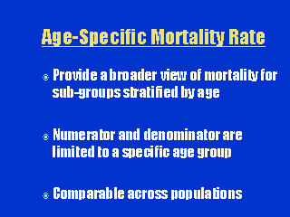For example, age-specific mortality rates provide a more comprehensive view of mortality for sub-groups of the population stratified by age. Therefore, the numerator and denominator are restricted to specific age groups. Because age-specific rates are more homogeneous than crude rates, they also can be more accurately compared across populations. |