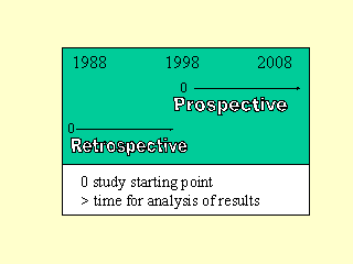 Cohort studies can be two types: (a) they either start in the present time and await outcomes in the future (prospective studies); or (b) the outcomes are measured in the present time on groups of people who can be categorized as having had certain characteristics in the past (i.e., a follow-up study of people born 20 years ago about whom a lot of data was collected at the time of birth to see if maternal complications have had a lasting effect on their offspring (retrospective studies)). Cohort studies are not analyzed by odds ratio, but by RR (Relative Risk or Risk Ratio). The rate that an outcome occurs in the exposed group is divided by the rate in the unexposed (i.e., if smokers develop 80 lung cancers per 1000, and nonsmokers only 5 per 1000, then the RR = 80 divided by 5 = 16; smokers were 16 times more likely to develop lung cancer). Other analyses are also possible. |
