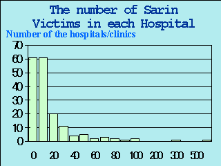 The number of the sarin victims in the 210 hospitals and clinics investigated is shown. Note that twenty-two of all gave treatment to more than 50 casualties, and 10 to more than 100 ones. |