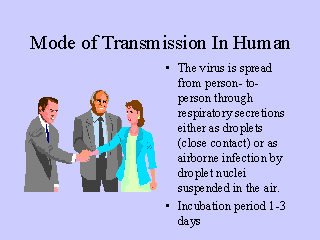 Once the virus is established in humans, transmission is from person-to-person by close contact through respiratory droplets or by the airborne route through droplet nuclei. Airborne infection is the predominant method of transmission in a crowded, enclosed environment. |