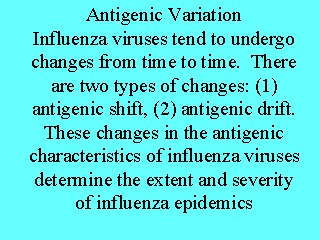 Antigenic changes occur primarily in type A influenza viruses. Although type B influenza virus may also undergo antigenic changes, its occurrence is less frequent. Influenza C is relatively stable; since it causes little or no illness in humans, it is of no medical importance. |