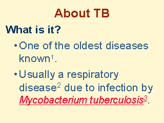 Bacillus, in Germany. At that time TB was very prevalent. (2) This is the most frequent presentation. Extra-pulmonary TB (e.g. miliary, skeletal, meningeal, gastro-intestinal) also occur, particularly in children, immigrants from countries where TB is more common and in people with impaired immunity. (3) Tubercle bacilli are acid alcohol-fast bacilli (AAFB), that means they strongly resist decolourisation with acid or alcohol.