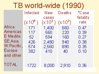 | E.Medite: Eastern mediterranean W. Pacific: excludes Japan, Australia, New Zealand Americas excludes USA and Canada Other (including USA, Japan, Australia, New Zealand) In 1990 prevalence of TB was 1,722,000,000; Incidence 8 million. *death/incidence ratio. 95% of new cases were in developing countries, 5% in developed countries. |