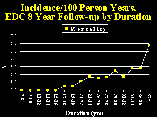 | Mortality is of course the severest complicaton of all and is dramatically increased in both Type 1 and Type 2 diabetes. The accompanying slide shows the mortality of a cohort of Type 1 diabetic subjects originally diagnosed in childhood in Pittsburgh. As can be seen, mortality rates approach 6% per year after 37 years of childhood onset diabetes, when the current age of the population would be in their young 40s. |