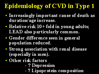 The epidemiology of heart disease in Type 1 diabetes is a little different for the relative risk is much higher and often reaches 10+ fold, reflecting the relatively low mortality from heart disease in young adults seen in the general population. As in Type 2 diabetes the gender difference in rates seen in the general population are greatly reduced. One of the strongest predictors of cardiovascular disease in Type 1 diabetes is the presence of kidney disease, particularly in men. The reasons for this may include a shared genetic predisposition to hypertension, a similarity in the pathogenetic process because athero- and glomerular sclerosis are very similar processes pathologically. Kidney disease also increases the levels of cardiovascular risk factors, blood pressure, fibrinogen and lipids for example. LDL cholesterol and triglycerides and smoking increase the risks of both CVD and kidney disease. Other risk factors include depressive symptomatology.