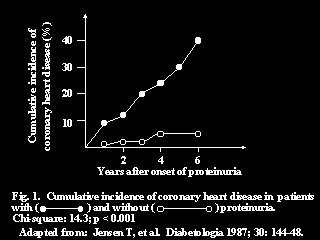| In a famous diabetes clinic in Copenhagen, the Steno Clinic, patients with Type 1 diabetes have been followed for many years. It was noted over a decade ago that those who had proteinuria, i.e. kidney disease, had a much higher risk of heart disease than those that did not develop proteinuria. |