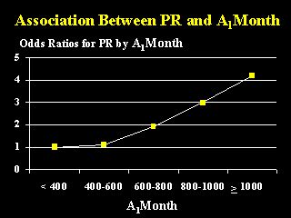 This slide and the next three demonstrate the odds ratios for having proliferative retinopathy or other complication by the number of A1months experienced. As can be seen for proliferative retinopathy the risk of having proliferative retinopathy increases steadily after about 600 A1months.