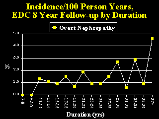 | Similarly overt nephropathy does not show a peak in decline at the duration of 20 years, but a tendency to increasing risk with duration. |