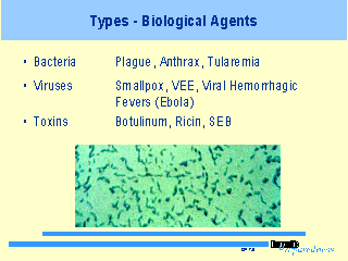 - Bacteria: Plague, Anthrax, Tularemia - Viruses: Smallpox, Viral Equine Encephalitis (VEE), Viral Hemorrhagic Fevers (VHF) (such as Ebola) - Toxins: Botulinum, Ricin, Staphylococcal Enterotoxin B (SEB) - Potential Biological Agents |