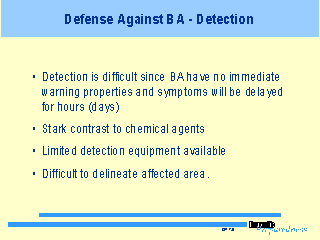 BA have no immediate warning signs upon release, and effects are usually delayed for a number of hours or days. As a result, first responders will not be called to respond to victims from a “release area” as typically occurs after a chemical or HAZMAT incident. This makes early detection and identification of the bacterial agent quite difficult.