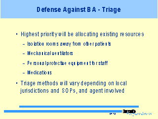 Triage typically will not be implemented soon after a BW attack because of the lack of warning and the insidious nature of the illness. When symptoms do begin to develop, patients will continue to present sporadically to health care facilities, unless a large epidemic occurs. When the pattern of patient complaints is confirmed to be secondary to a BW attack and this information is made public, hospitals will become overwhelmed by infected patients and by individuals worried that they may have been exposed to the agent. Triage will now be necessary to properly allocate existing resources, including isolation rooms, ventilators, PPE, and medications.