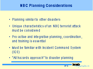 - Future terrorist attacks can hopefully be prevented by the work of law enforcement officials and various government agencies. Preparing to respond to this type of catastrophe is very similar to contingency planning undertaken for other types of manmade or natural disasters. Pro-active and integrated planning, coordination, training, and realistic drills will allow each community to respond to these events in an organized, efficient manner, using available Federal, State, and Local resources. - Successful disaster planning requires hospital personnel to be familiar with the ICS, standard operating procedures (SOPs), triage, and PPE. A disaster plan, however, is only as effective as the assumptions on which it is based. Unfortunately, most medical disaster planning initiatives are based on incorrect assumptions and misconceptions. As a result, many disaster plans prove to be ineffective in actual use. - In the hospital, disaster planning has traditionally been compartmentalized depending on the type of disaster. For example, one plan is created for external disasters, another for HAZMAT accidents, and a completely different plan for natural disasters. The end result is often a confusing, cumbersome, disaster-planning document that is unfamiliar to hospital personnel. Proficient disaster planning requires a unified, standardized, “all-hazards approach” to disasters that are likely to occur in the community. |