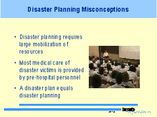 - Misconception #1: Disaster planning requires large mobilization of resources. Traditionally, medical disaster planning has focused on the need to rapidly mobilize large numbers of resources (physicians, nurses, support personnel, supplies, etc.) to care for multiple trauma victims, numerous displaced individuals, and the widespread devastation that seemingly accompanies a disaster. This occurs, in part, on the perception that disasters are emergencies that exceed or overwhelm the resources available in a given area or community. In fact, one of the biggest challenges in a disaster is managing these resources. When a “real” disaster occurs (manmade or natural), large numbers of hospital personnel will arrive at the emergency department (ED) to offer assistance, often without being requested. Unfortunately, many of these “volunteers” are members of the medical staff who never participated in any previous disaster drills. These individuals typically are unfamiliar with routine ED policies and procedures, have never used or seen the disaster triage tagging system, and are uncomfortable receiving orders from the chain of command implemented during the disaster. The end result is a loss of control over the disaster event. The responding personnel function independently without any unified direction or control. Response to an terrorism event would be further confused if these responders lacked NBC training. - Misconception #2: Most of the medical care for disaster victims is provided by pre-hospital personnel. During the planning process, many hospitals incorrectly assume that all of the disaster victims will arrive by ambulance after being triaged, decontaminated, and stabilized at the scene by pre-hospital personnel. Because of this assumption, hospitals are often caught unprepared for the number of patients that arrive by private vehicle who have never received any form of pre-hospital care. Most of these individuals will only have minor injuries, arrive unannounced to the closest ED, and will consume most of the bed space and personnel prior to the arrival of the most critical patients by EMS. |